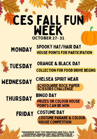 Not only do we have the C.E.S. Monster Bash Halloween Dance happening in our school this evening, but we are looking forward to a week of spirit activities next week leading up to Halloween day! Please see the details below regarding the upcoming themes and events in our school community next week: